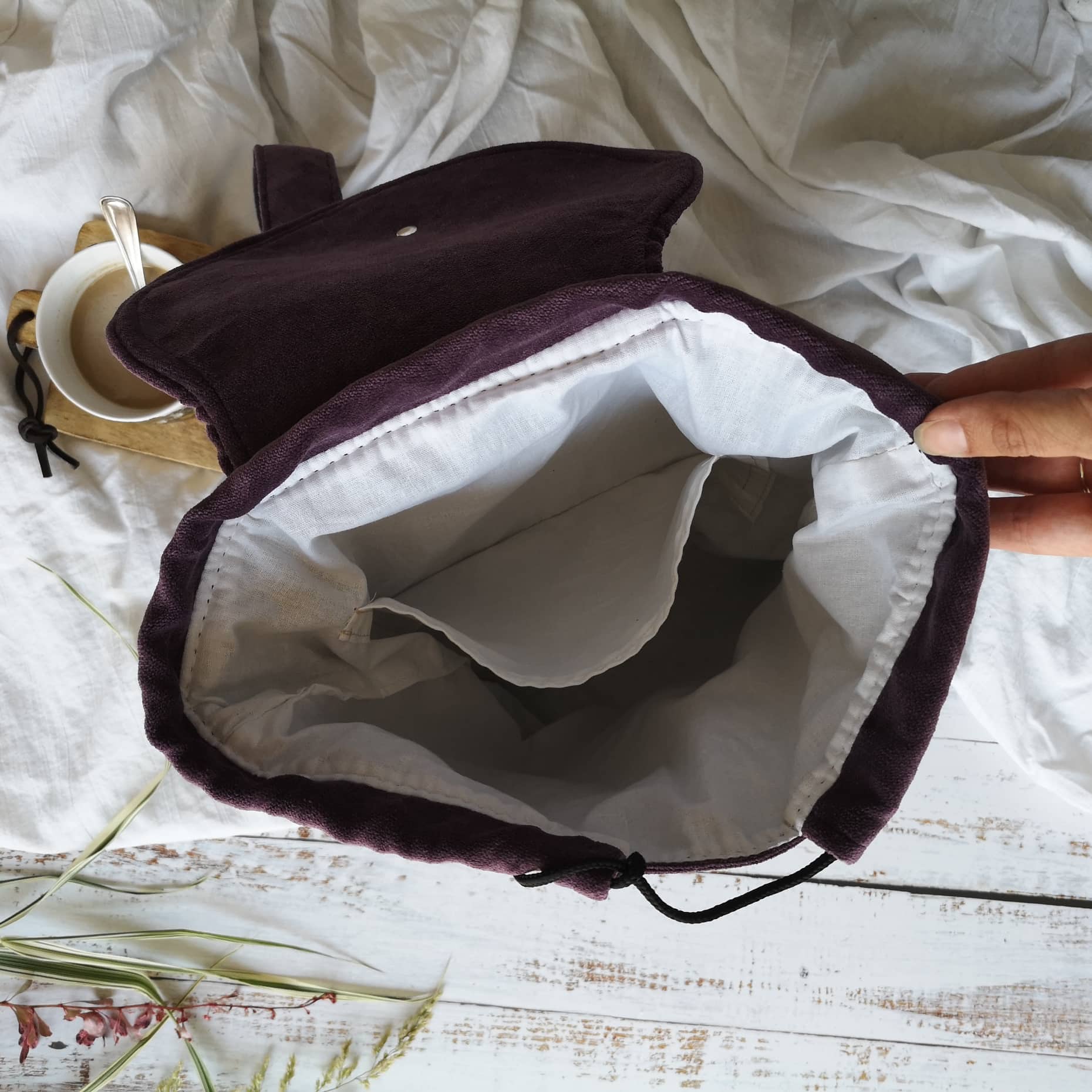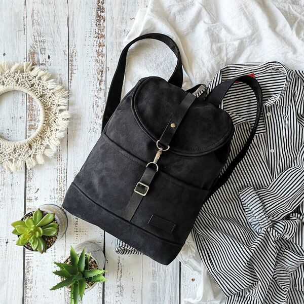 Batoh Thea je skvelý spoločník na každodenné používanie, či do školy, do práce, alebo len tak... kamkoľvek :) Je ušitý z veľmi pevnej tkaniny, ktorá je na dotyk, aj štruktúrou jemná ako zamat. Batoh je veľmi pevný, dobre drží tvar, konštrukčne, aj materiálovo je prispôsobený aj na väčšie zaťaženie (spevnené remene podšité polypropylénom, výstuž v chrbtovej časti). V prednej časti batohu sa nachádzajú dve menšie vrecká. Zatvára sa zaťahovacou šnúrkou a koženým remeňom s karabinou, ktorý je dĺžkovo nastaviteľný podľa potreby a naplnenosti batoha.Je podšitý bielou bavlnenou tkaninou, vo vnútri sa skrýva vrecko na pár drobností.Ramenné popruhy sú dĺžkovo nastaviteľné. Rozmery:Výška 35cmŠírka v hornej časti: 34cmŠírka v spodnej časti (od rohu po roh): 27cmHĺbka: 8cm