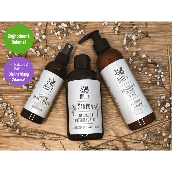 Ak si objednáte 2 zvýhodnené balenia, automaticky vám k objednávke ZDARMA pribalíme Biofy® Ošetrujúci olejček na vlasy s 9 vzácnymi olejmi. Olejček v hodnote 14,90 € je ideálny na ošetrenie poškodených končekov, lepšie rozčesanie a ochranu vlasov pred poškodením, či strate vlhkosti.