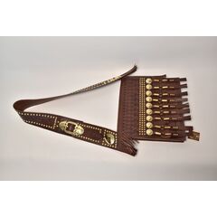 Materiál kapsy: Koža Druh kapsy: Zatváravá Zdobenie traku: Hĺbková ražba, malé obvodové kovanie Šírka traku: cca 9 cm Zdobenie kapsy: Hĺbková ražba, 3 rady malé a 1 rad veľké kovanie Zdobenie strapce: Kované strapce