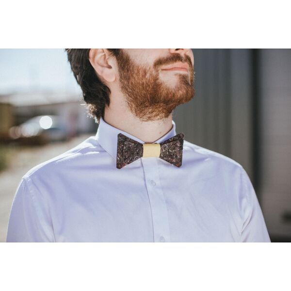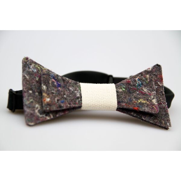 Motýlik z recyklovaného textilu pre každého, komu záleží na štýle, inováciách a ekológii. Ručne šitý z netkanej textílie vyrobenej recyklovaním nepoužitého textilu, upcyklovaných kravát a bavlneného popruhu v strede.