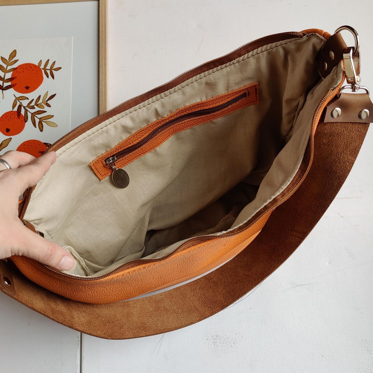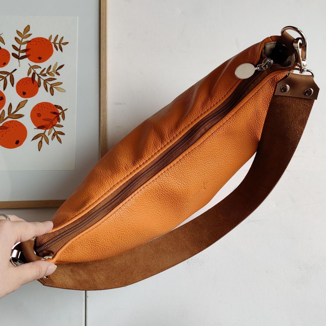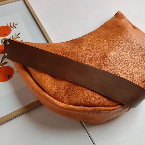 Luna kabelková maxi ľadvinka, ktorá s vami splynie Je kombináciou kabelky a ľadvinky. Vďaka svojmu tvaru a materiálu sa kabelka prispôsobí vašim krivkám a veľmi dobre sa nosí.Kabelky Luna sú ušité z mäkkých talianských koží rôznych farieb a typov.Zdobí ich široký kožený popruh, ktorý je možné nosiť na ramene, alebo ako ľadvinku cross-body.Zatvára sa na zips. Sú podšité kvalitnou bavlnenou látkou s vnútorným vreckom na zips. Ku kabelke je možné dokúpiť aj dlhý cross-body popruh. ROZMERY Výška: 24 cm (v strede kabelky)Šírka: 37 cm (najširší bod)Hĺbka: 7,5cm (najširší bod) Široký popruh: 72 cm (s karabínami) - výška modelky 163cm