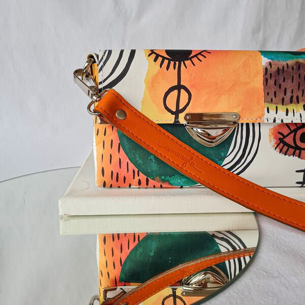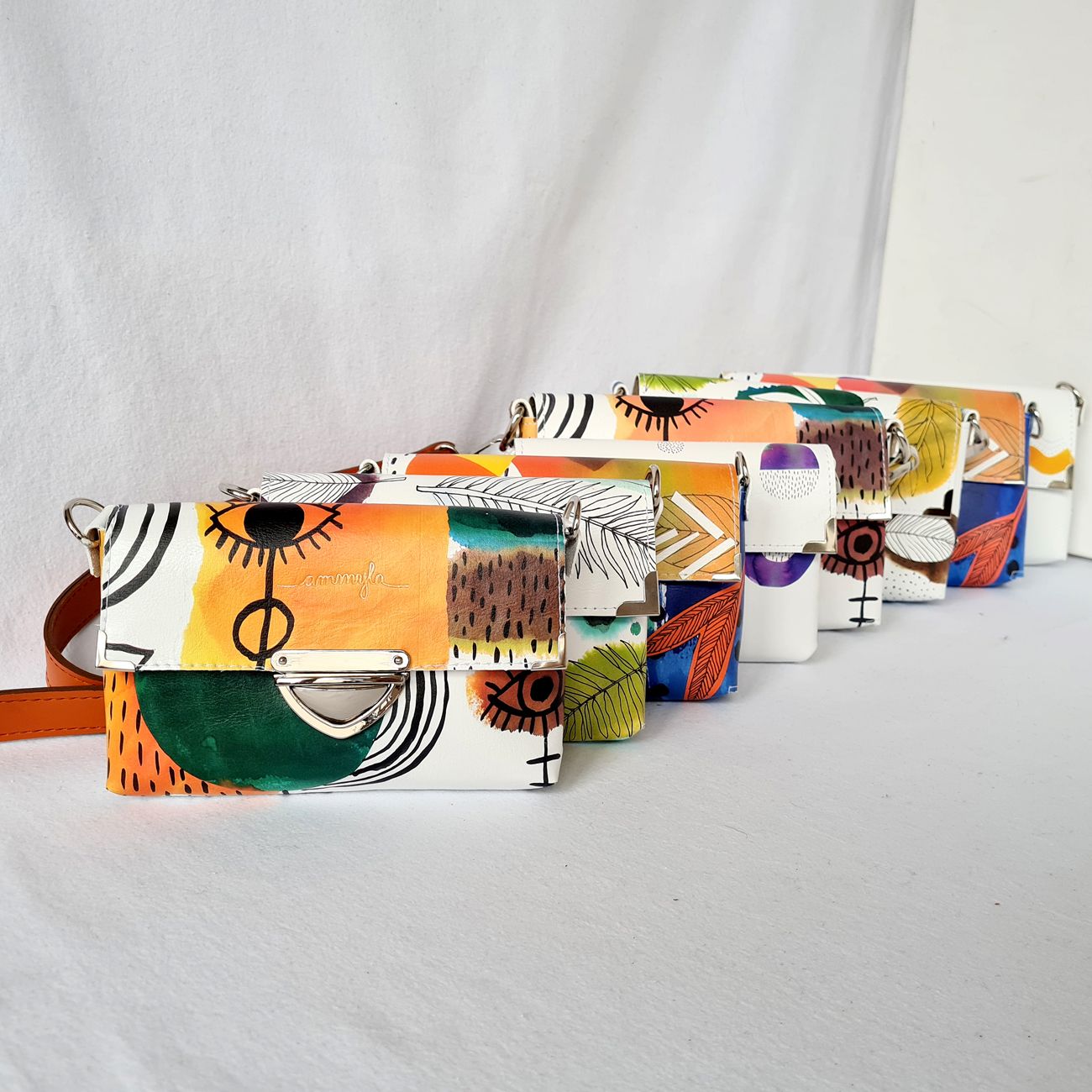 MidiMe je multifunkčná príručná kabelka/ľadvinka, po odňatí popruhov aj dočasná peňaženka a ak chcete, môže byť aj detskou kabelkou pre malú parádnicu ;) Kolekcia Joy - Motív kabelky vychádza z pôvodných detských malieb a je dotvorený rôznymi výtvarnými technikami. Grafiky sú následne zdigitalizované a za pomoci špeciálnej tlačiarne s vysokým rozlíšením vytlačené priamo na kožu. Viac o kolekcii sa dozviete tu.Je vyrobená z kvalitnej hovädzej kože štiepenky, s tenkým polyuretánovým filmom (PU - laminovanie). Povrch z PU spôsobuje, že táto useň nie je citlivá na vsakovanie tekutín a ľahko sa udržiava. Obmedzený prístup vlhkosti nezmäkčuje jej povrch a predchádza tak pretrhnutiu.Je spájaná výhradne prostredníctvom nitov, bez použitia šitia. Má kratší popruh, ktorý si viete prehodiť cez ramená, alebo pripnúť na pás. Vnútro kabelky je podlepené tenkou kožou, ktorá je príjemná na dotyk a kabelku navyše spevní. Po obvode je kabelka prešitá silným stehom. Popruhy sú vyrobené z dvoch vrstiev kože (zošité spolu). V prípade, že by ste na kabelku chceli dlhší popruh, napíšte to do poznámky (myslite však na to, že ak ju chcete nosiť aj na páse, aby popruh nebol pridlhý). Rozmeryvýška 13cmšírka 21,5cmhĺbka 3cmpopruh cca 105cm (s možnosťou predĺženia alebo skrátenia) Bycast - pravá koža s povrchovou úpravou