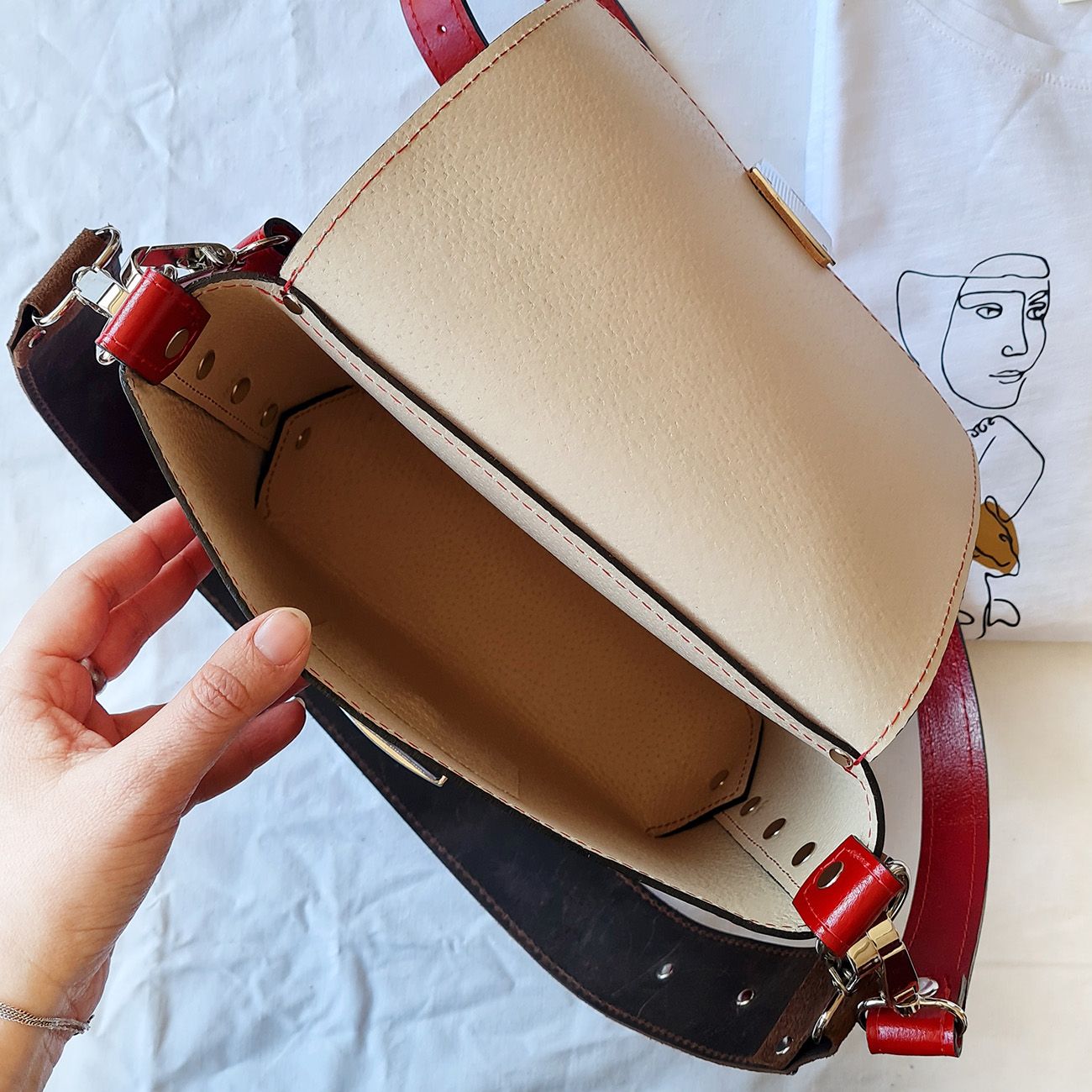 Kabelka Nia zaujme každé zvedavé oko už na prvý pohľad Je ušitá z kvalitnej hovädzej kože štiepenky, s tenkým polyuretánovým filmom (PU - laminovanie). Kože je tak pekne hladká a lesklá.Povrch z PU spôsobuje, že táto useň nie je citlivá na vsakovanie tekutín a ľahko sa udržiava.Obmedzený prístup vlhkosti nezmäkčuje jej povrch a predchádza tak pretrhnutiu. Spájaná je výhradne prostredníctvom nitov, bez použitia šitia.Šitie je použité iba na popruhy a po obvode kabelky., ktorá je Je podlepená jemnou tenkou kožou, ktorá jej dodáva luxusnejší vzhľad. Na rozdiel od ostatných kabeliek strednej veľkosti, je Nia viditeľne širšia a tým pádom aj priestrannejšia. Hrany kabelky ako aj remeňov sú ošetrené farbou a voskom. Kabelku výrazne spestruje jej široký, odnímateľný kožený remeň, ktorý je z rubovej strany zdobený vzorovanou bavlnenou látkou. Obidva remene sú vyrobené z hrubšej hovädzej kože crazy-horse. Podobne ako kabelky MiniMe, MidiMe a MaxiMe je aj Nia dostupná v rôznych farbách a druhoch kože. Ak máte záujem o inú kožu, alebo farbu, neváhajte nás kontaktovať. Ak máte záujem o iný motív látky na bavlne širokého popruhu, napíšte to do poznámky k objednávke. O dostupnosti daného motívu vás budeme informovať, prípadne nás kontaktujte vopred. V prípade, že máte záujem o iné farebné prevedenie, kontaktujte nás. Rozmery: Výška: 20cm Šírka: 21 cm Hĺbka: 7 cm Dĺžka cross-body remeňa: max. 130cm Dĺžka širšieho remeňa: cca 60cm Bycast - pravá koža s povrchovou úpravou