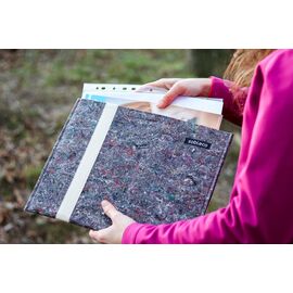 Puzdro na okuliare vyrobené na Slovensku, ušité z recyklovaného materiálu.