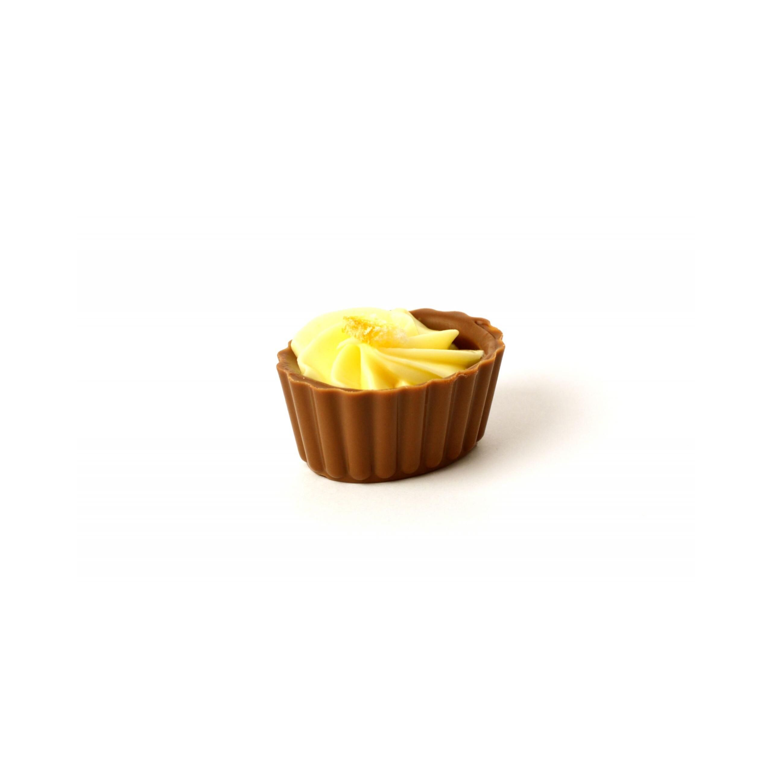 Bonbón z mliečnej čokolády naplnený čokoládovým krémom s pomarančovou príchuťou